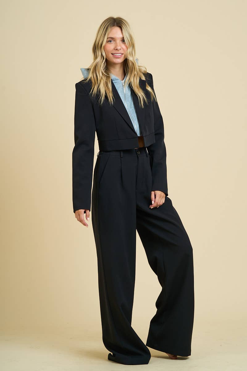 Redefine modern sophistication with the Cropped Jacket with Inner Hoodie—a sleek fusion of tailored elegance and casual comfort. This innovative design combines the sharp, structured lines of a classic suit jacket with the laid-back ease of a hoodie, creating a standout piece that effortlessly bridges the gap between formal and casual wear.