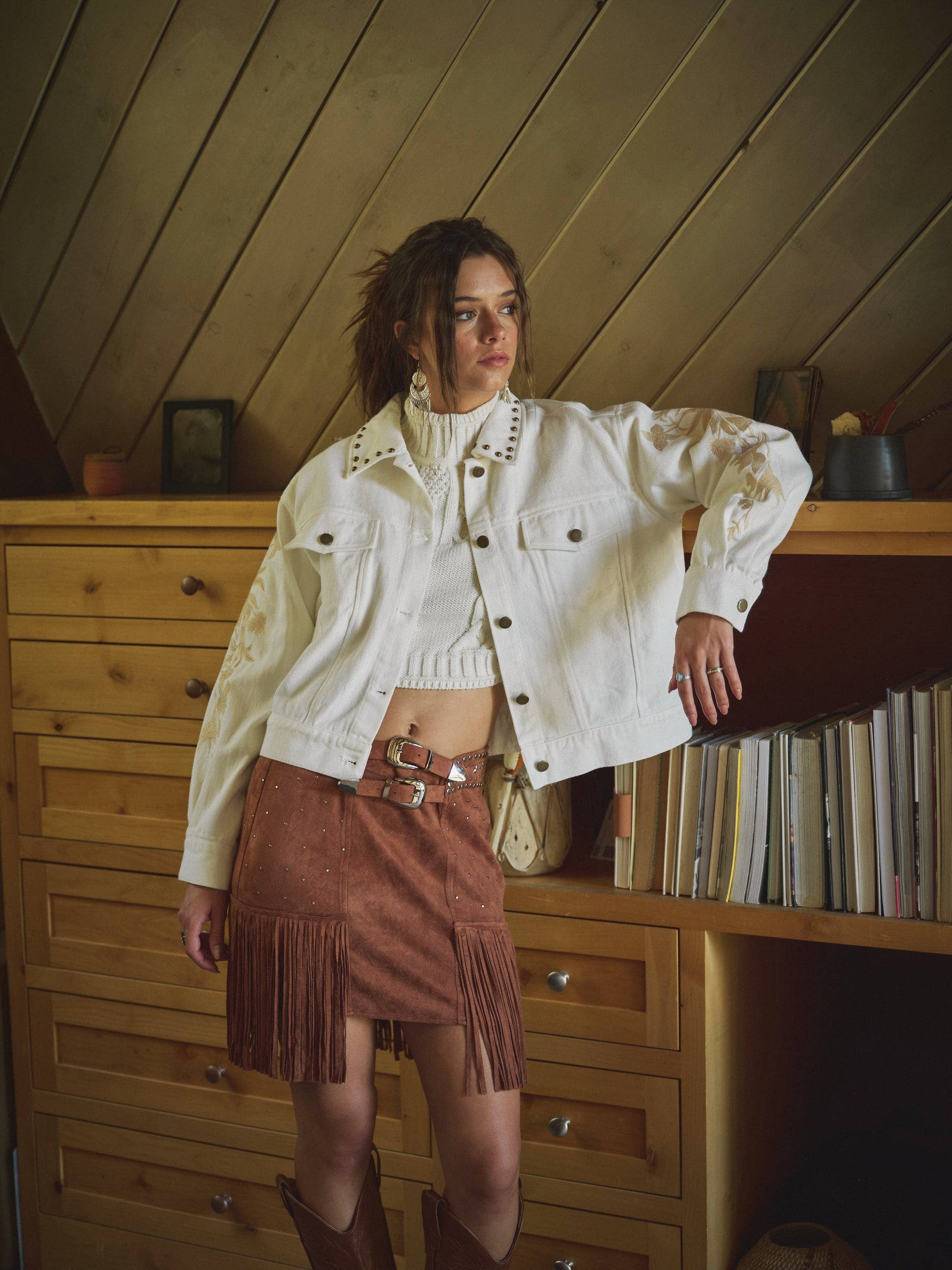 We gave our Trucker Jacket an upgrade with a boxier, relaxed fit, crafted to flatter everybody. Then, we westernized it with a scallop design in the front, yoke detailing on the back, and western yee haw howdy inspired embroidery.