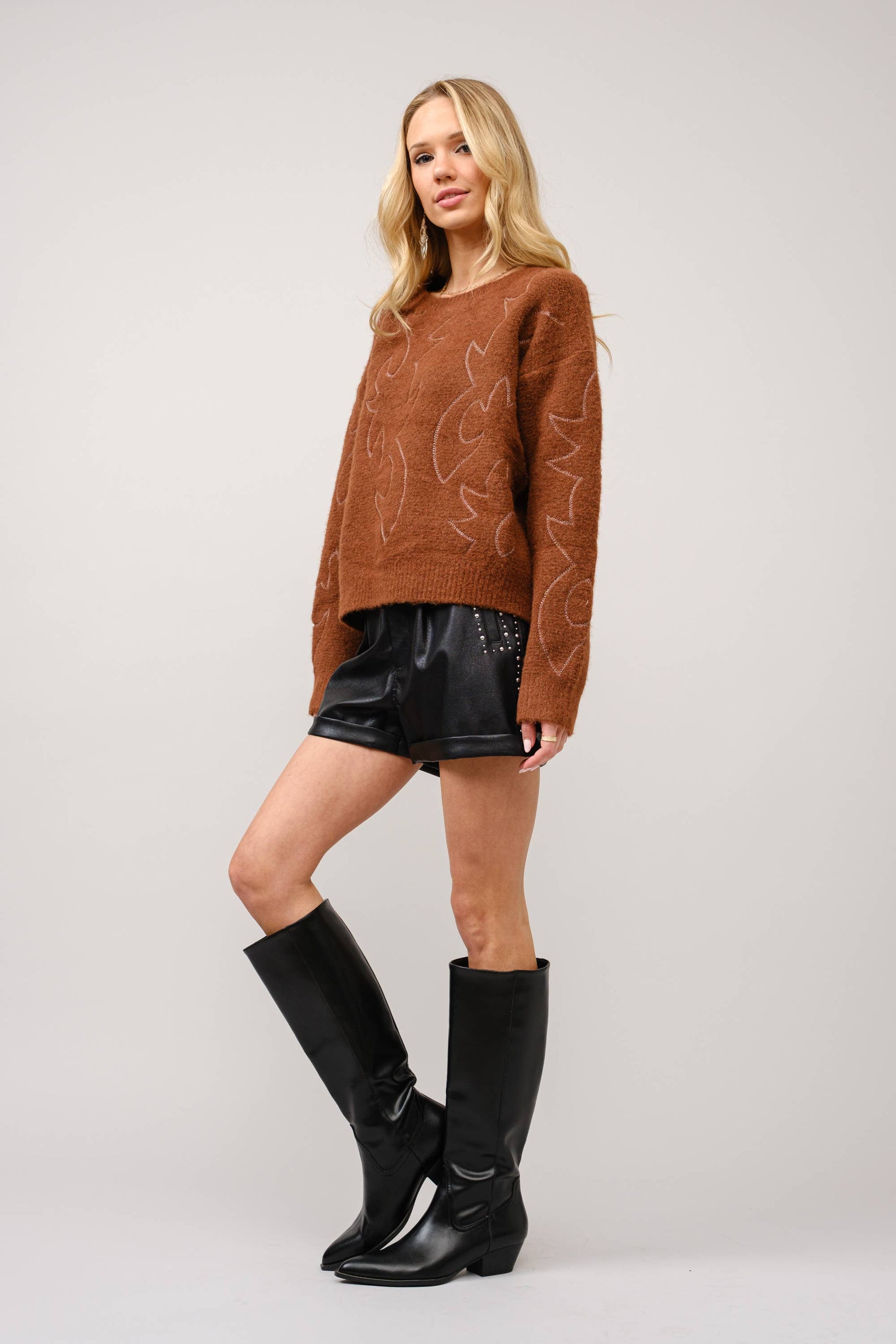 A cozy crew neck sweater featuring a unique western boots stitch pattern, perfect for adding a touch of style to your wardrobe. Crafted from a soft and warm fabric blend.