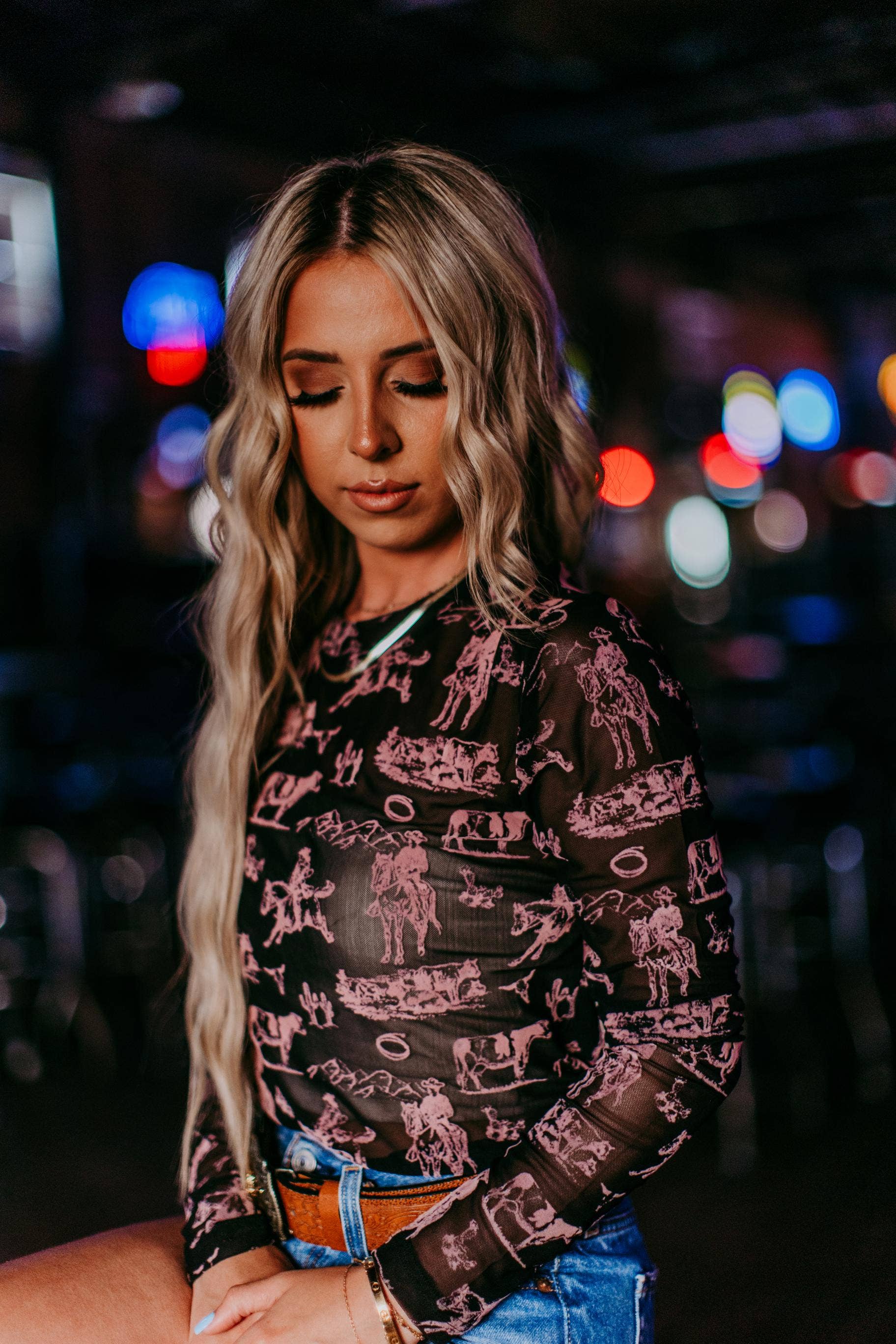Introducing the MK530 Western Scene 3D Print Mesh Top from Merigold Kiss. This knit top for women embodies the western lifestyle. Merigold Kiss Wholesale is a family-owned Texas-based brand that caters to retail boutiques nationwide.