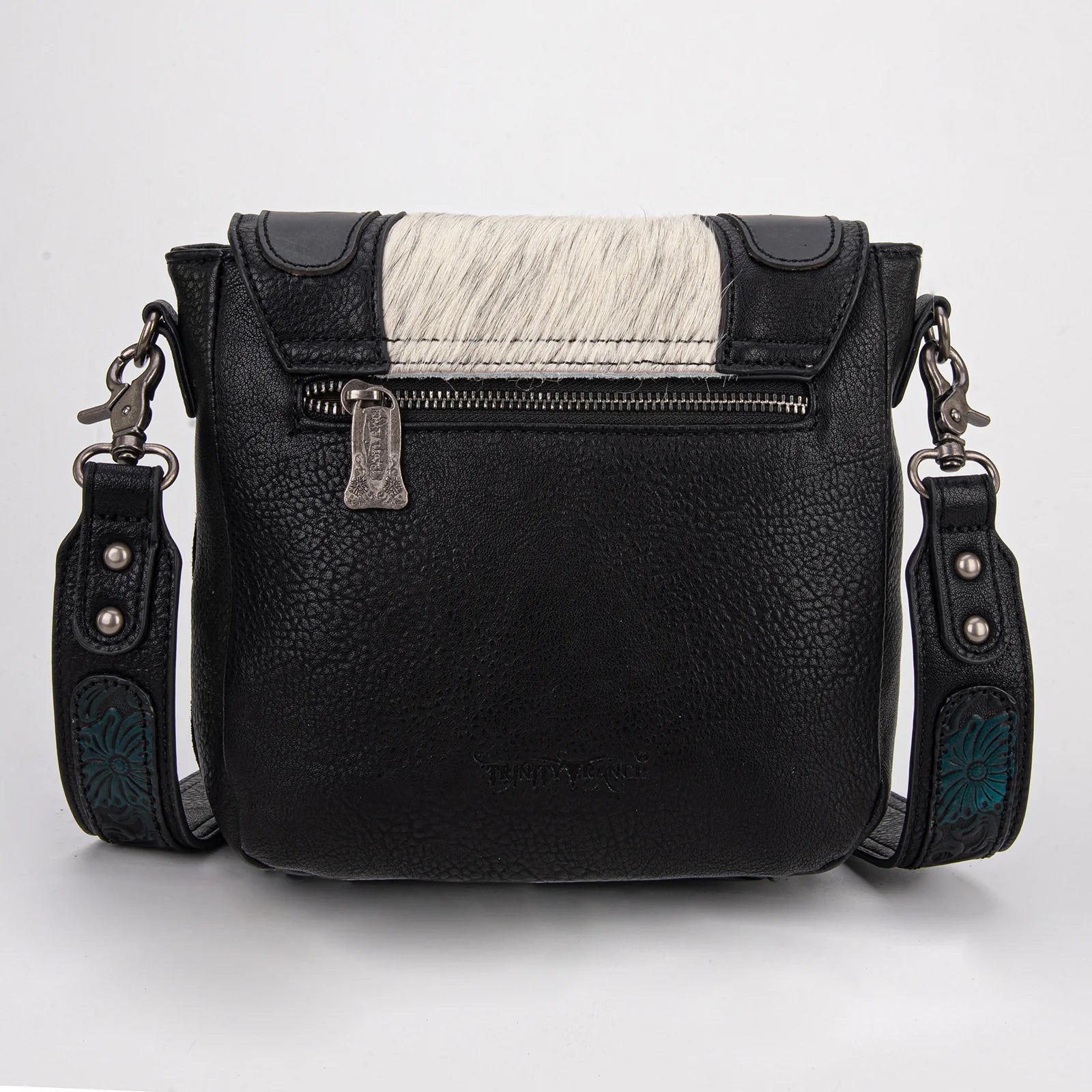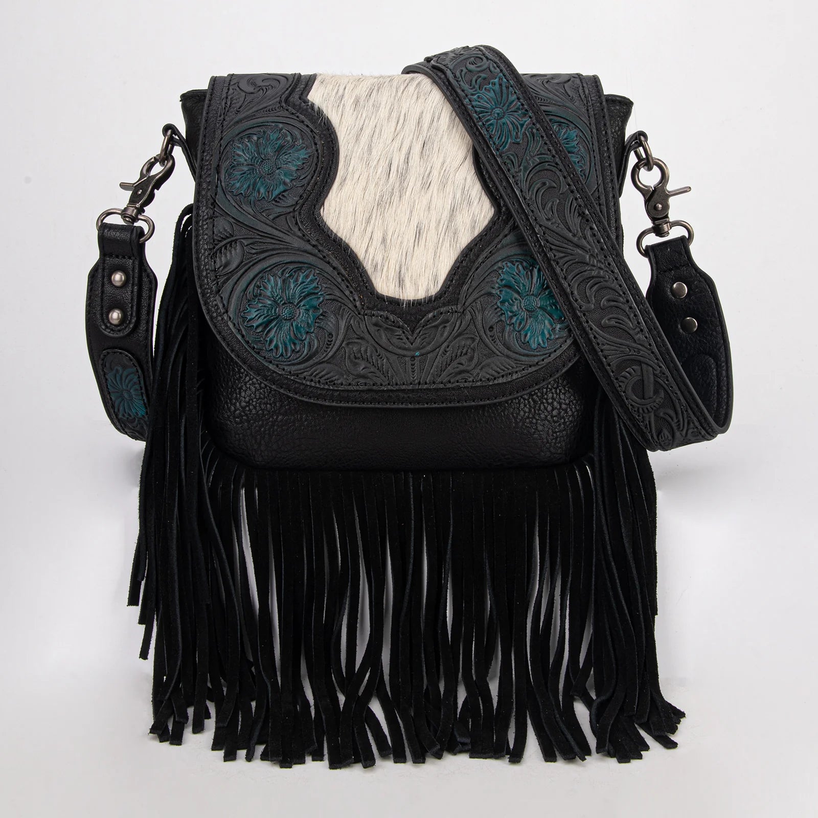 Trinity Ranch Genuine Hair-On Cowhide Tooled Fringe Crossbody Bag- Black