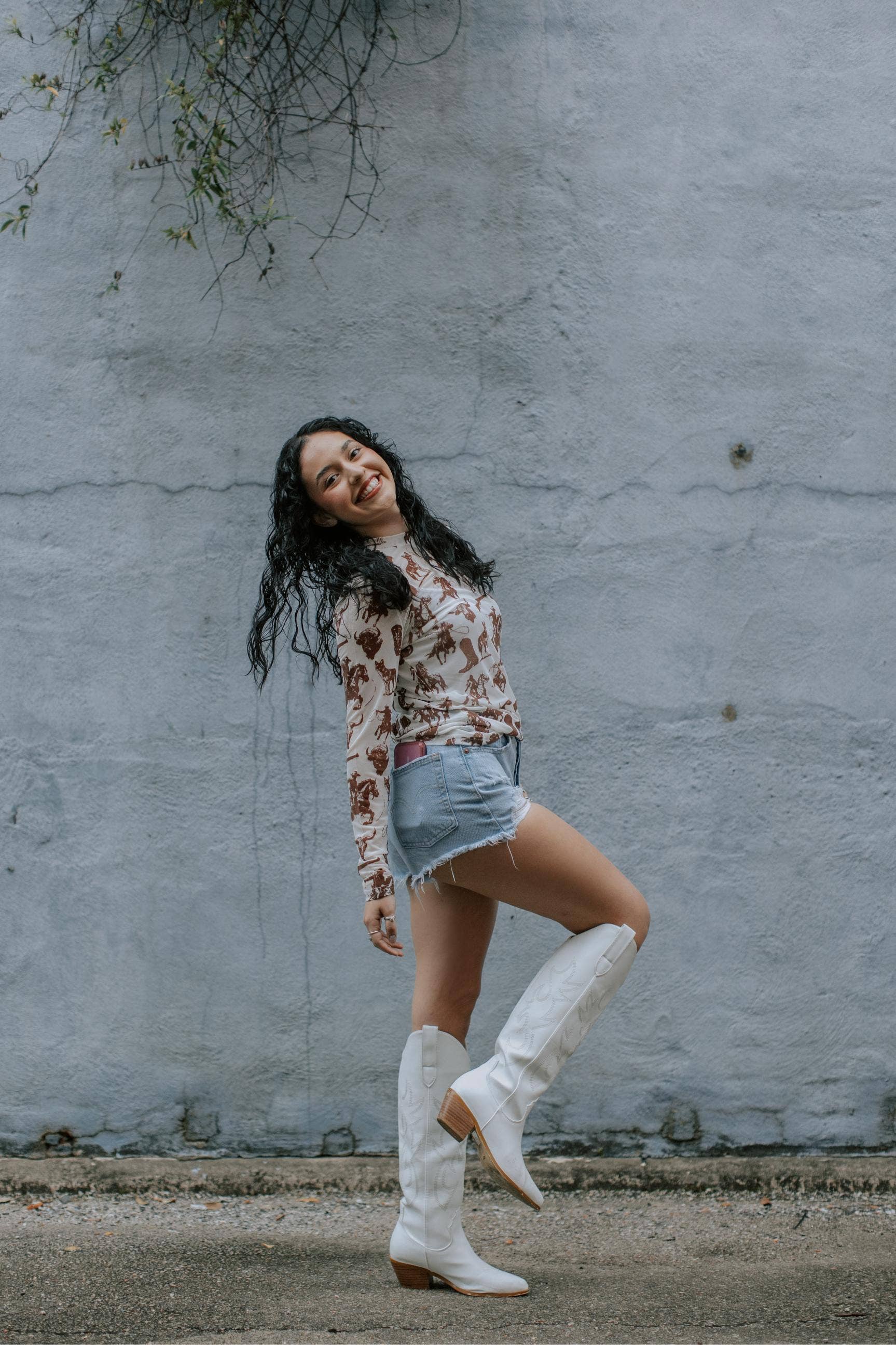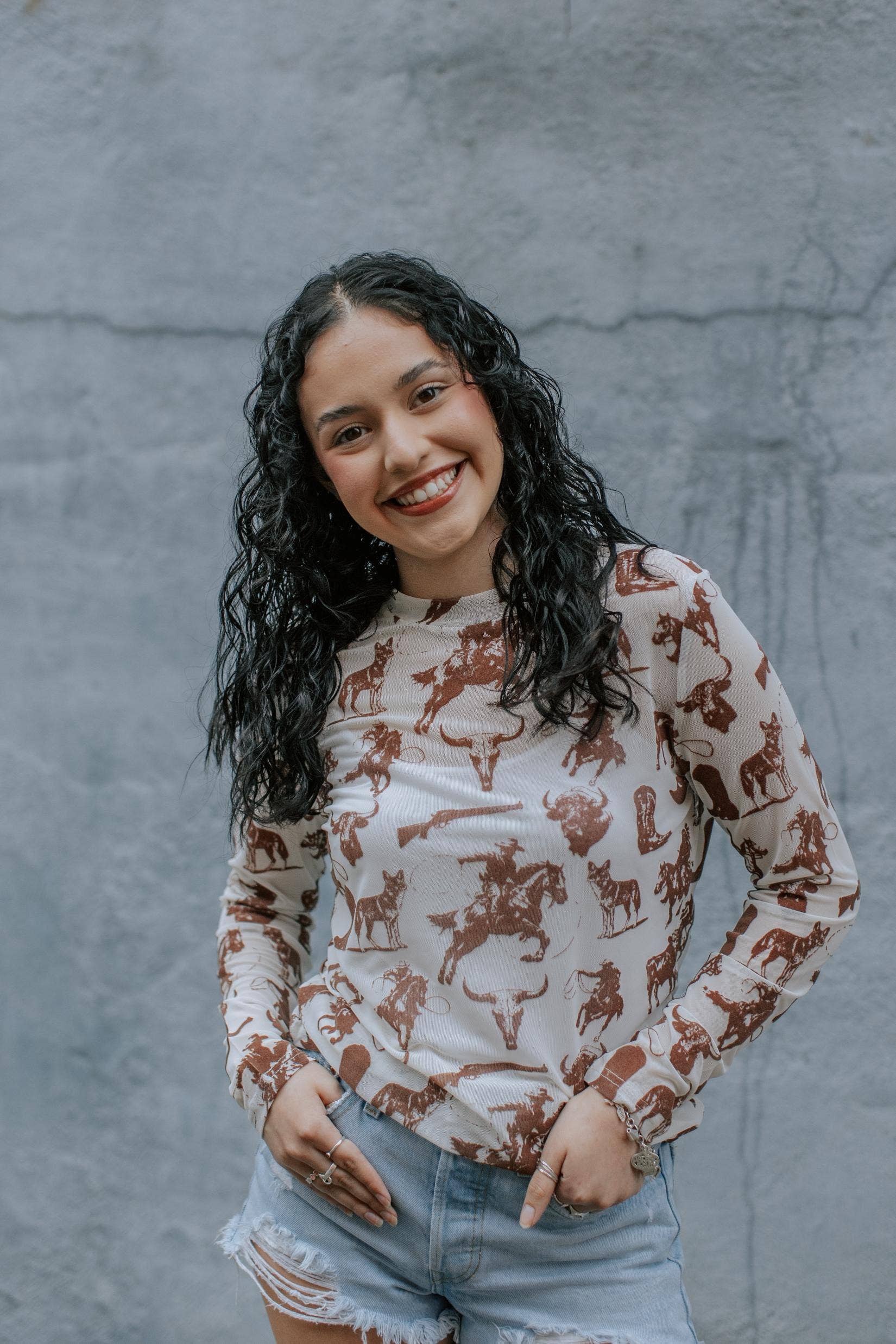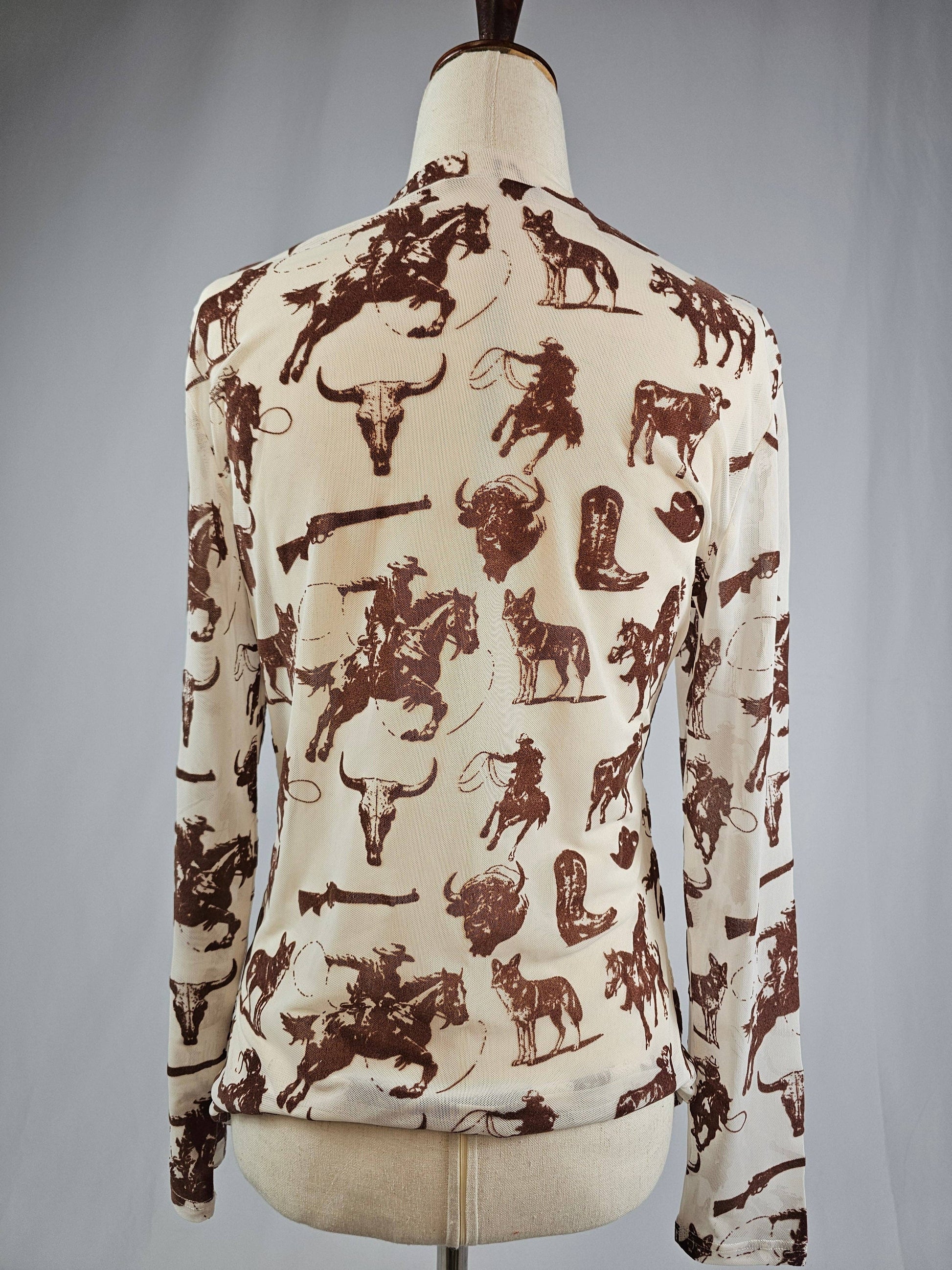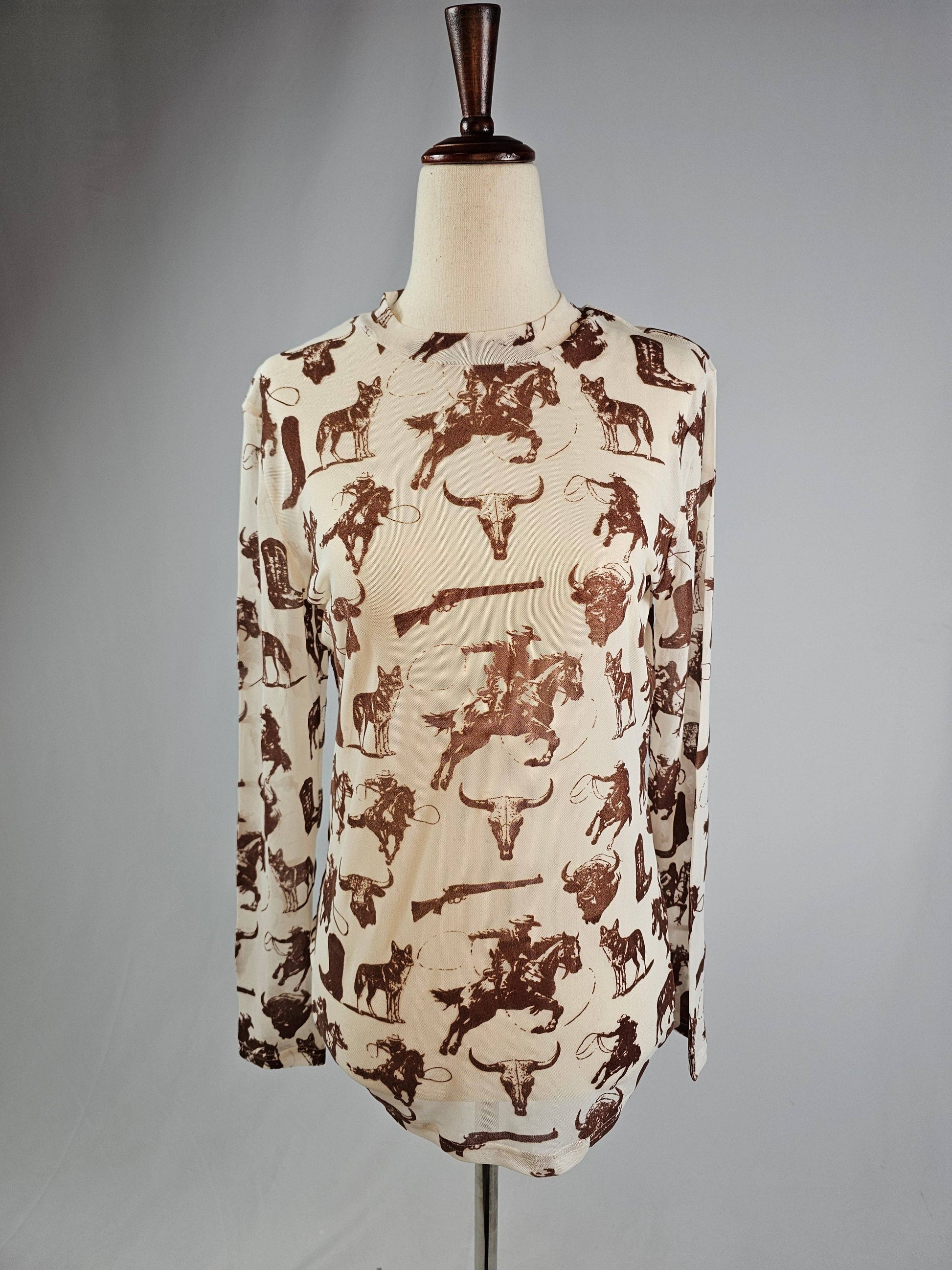 Sheer, stylish, and a little bit wild—this mesh long sleeve is covered in western-inspired graphics from cowboys and buffalos to longhorn skulls. The cream base with rich brown print makes it easy to layer and style, whether you throw it over a bralette, tank, or use it as a statement piece under a jacket. Perfect for rodeo nights, concerts, or festival season, it’s the ultimate cowgirl-cool layer.